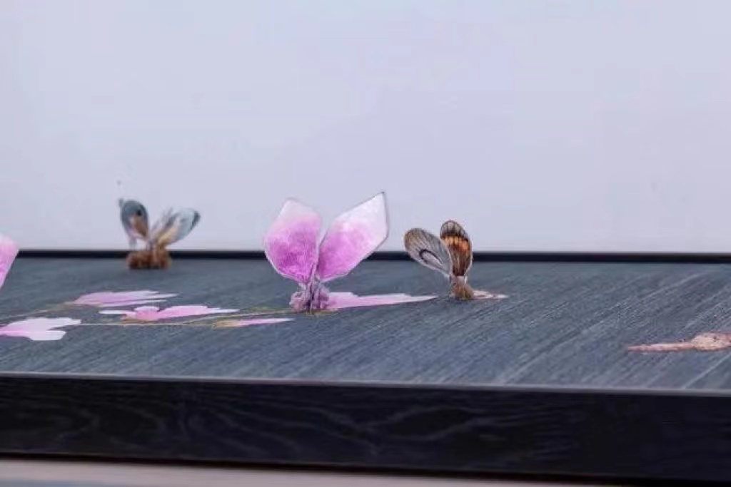 2022年,三维动态苏绣“玉兰蝴蝶”绣制成功,“玉兰绽放彩蝶来”的生动场景出现在苏绣织就的世界里,张雪的三维苏绣梦实现了。“唤醒”这些蝴蝶和花卉的“魔法”是一种记忆合金材料。