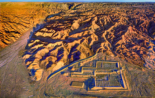 当年的悬泉置虽不宏伟,但也颇具规模。它坐落在火焰山前的戈壁滩上,东侧入谷直通悬泉水,有用水之便。北侧驿路东西延伸畅通。整座建筑坐西朝东,有高墙大院围护,冬能御寒风,夏能躲酷暑。方寸之间,用尽了地利。
