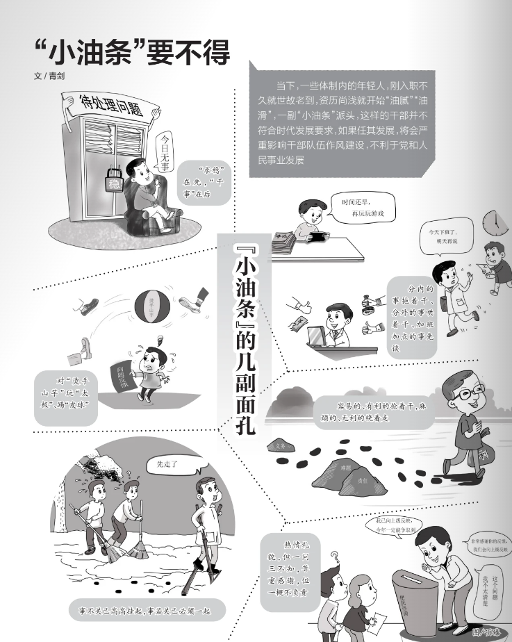 这些“小油条”们,明明年纪轻轻,正是年富力强、开拓奋进、施展才华的时候,干工作却提不起兴趣和精神,出现“悠着干”“应付干”“照着干”“看着干”“推着干”等现象,影响了基层工作的正常运转,制约了基层治理能力的提升。
