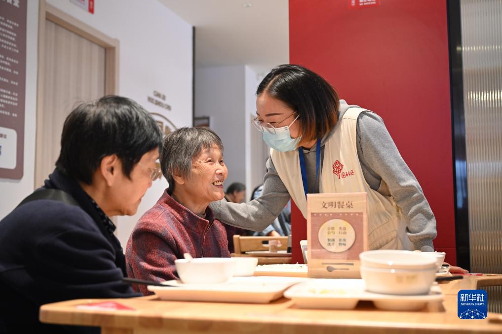 2023年11月16日,社区工作人员在福州市鼓楼区庆城社区长者食堂内与用餐老人交流。新华社记者 姜克红 摄