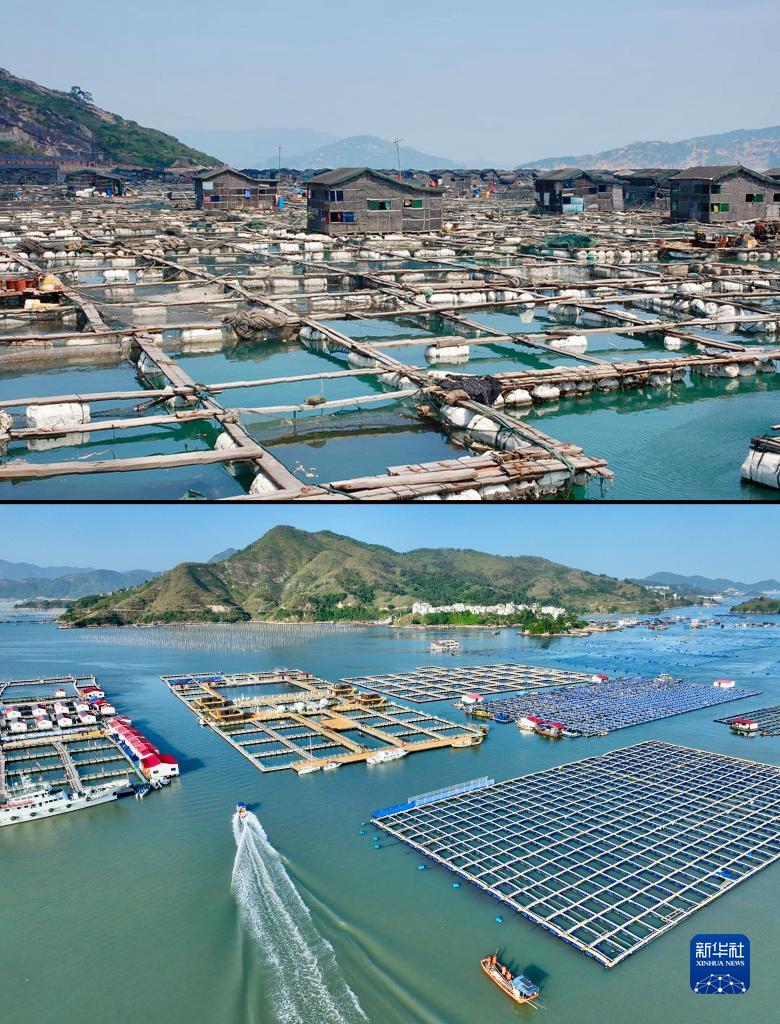 拼版照片:上图为2007年7月拍摄的福建宁德三都澳海域传统渔排(资料照片);下图为2023年11月18日拍摄的福建宁德七星海域升级改造后的渔业养殖区(无人机照片,新华社记者姜克红摄)。新华社发