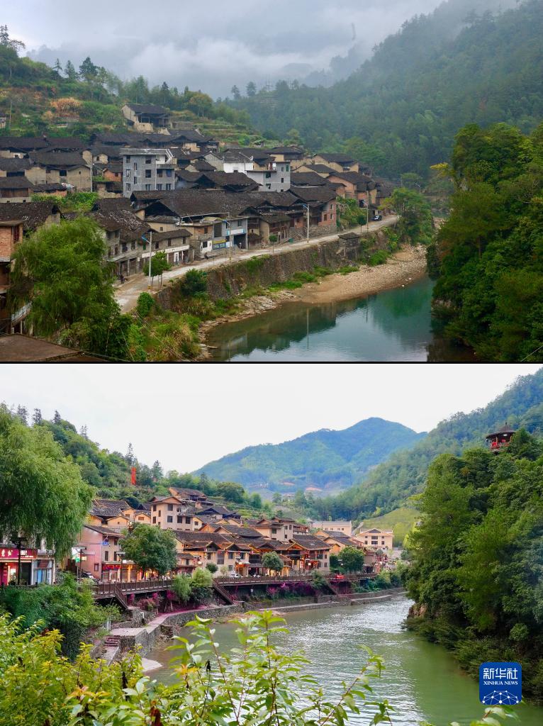 拼板照片:上图为2014年10月22日拍摄的宁德市寿宁县下党乡下党村村貌(新华社记者姜克红摄);下图为2023年8月5日拍摄的宁德市寿宁县下党乡下党村新貌(新华社记者林善传摄)。新华社发