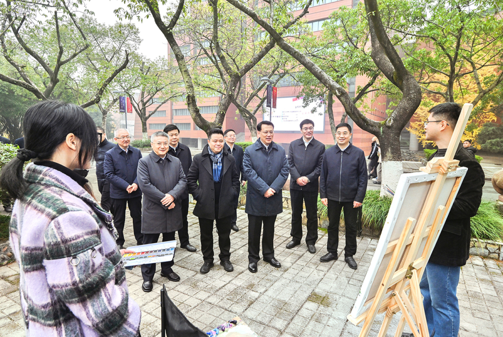 四川美术学院培养造就了许多美术大师、推出了大批艺术精品。走进当代美术馆,袁家军听取学科建设和人才培养情况介绍并观看美术作品展。他指出,重庆大山大水的壮美风光为美术创作提供了广阔空间,现代化新重庆建设的大场景为艺术创作提供了丰富题材,美术工作者要兼收并蓄,深入生活实际,打磨创作更多优秀作品。在考察川美设计专业产教融合成果时,袁家军指出,设计要与社会发展、产业发展相结合,更好服务城市形象提升,满足群众高品质生活需求。工业设计是一座富矿,川美要发挥自身优势,推动美学与现代工业发展相融合,赋予工业品更多艺术气质和时代内涵。看到师生正在进行写生创作,袁家军同大家交谈,希望青年学子珍惜新时代、拥抱新时代,坚定理想信念,勤奋学习、大胆创新,在书写艺术创作的精彩华章中展现中国气派。走进川美照明艺术研究院,袁家军指出,川美是重庆文化的“金名片”,要推动学科建设与时代发展、城市发展同进步,促进艺术创作与现代技术相结合,赋予作品更多技术感、艺术感和时代感,在助力文化强市建设中发挥重要作用。