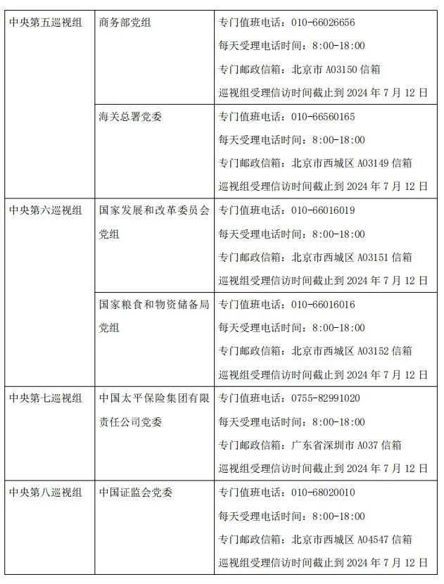 经党中央批准,二十届中央第三轮巡视将对国家发展和改革委员会、财政部、自然资源部、住房和城乡建设部、农业农村部、商务部、中国人民银行、审计署、海关总署、国家税务总局、国家市场监督管理总局、国家金融监督管理总局、中国证券监督管理委员会、国家统计局、国家知识产权局、国家粮食和物资储备局、国家能源局、国家林业和草原局、国家外汇管理局、中华全国供销合作总社、全国社会保障基金理事会、中国地质调查局、上海证券交易所、深圳证券交易所、中国进出口银行、中国工商银行股份有限公司、中国农业银行股份有限公司、中国银行股份有限公司、中国建设银行股份有限公司、交通银行股份有限公司、中国中信集团有限公司、中国人寿保险(集团)公司、中国太平保险集团有限责任公司、中国出口信用保险公司等34家单位党委(党组)开展常规巡视。
