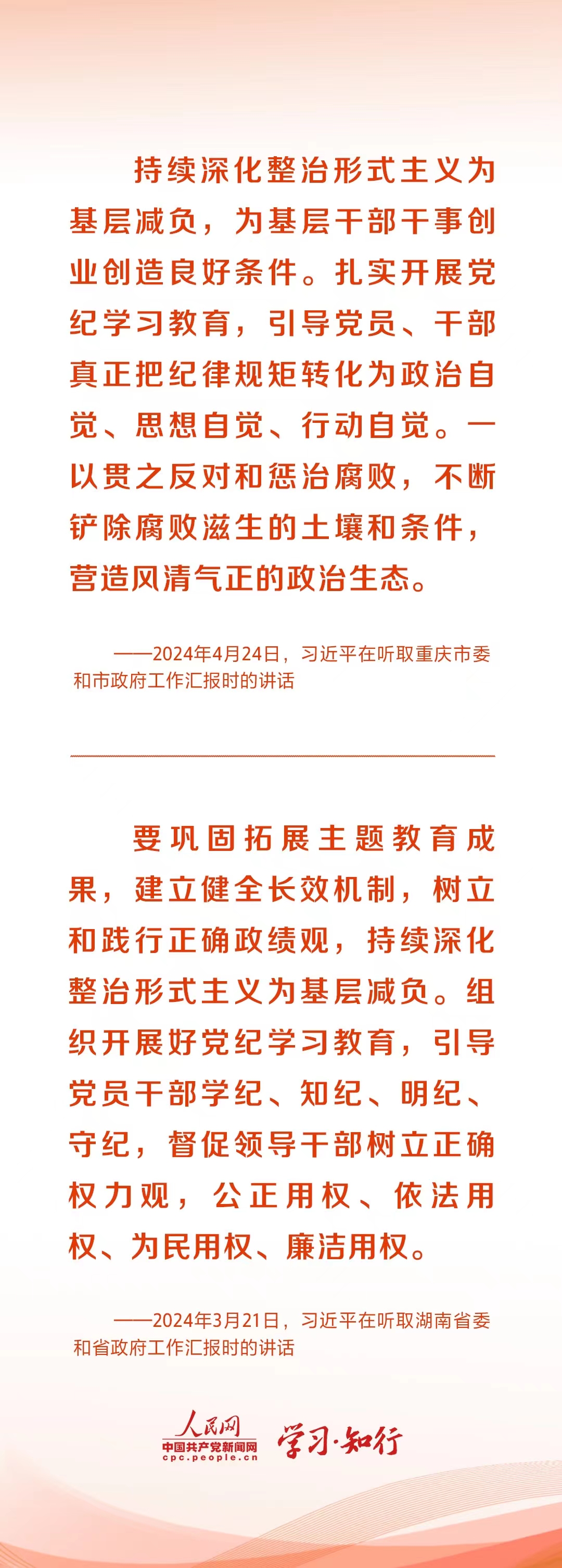3月,湖南调研,习近平指出,党中央明确要求为基层减负,坚决整治形式主义、官僚主义问题,要精兵简政,继续把这项工作抓下去。