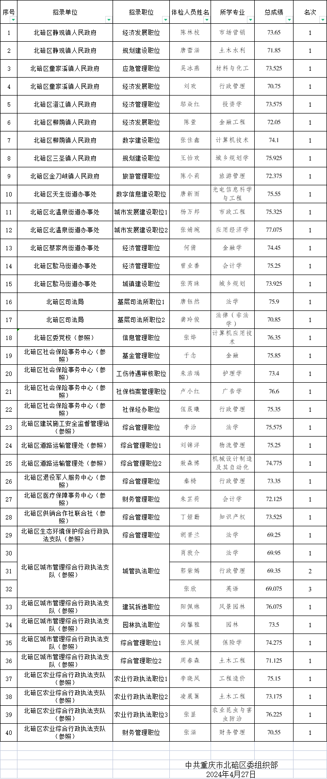 重庆市北碚区2024年度公开考试录用公务员笔试、面试和总成绩公布表