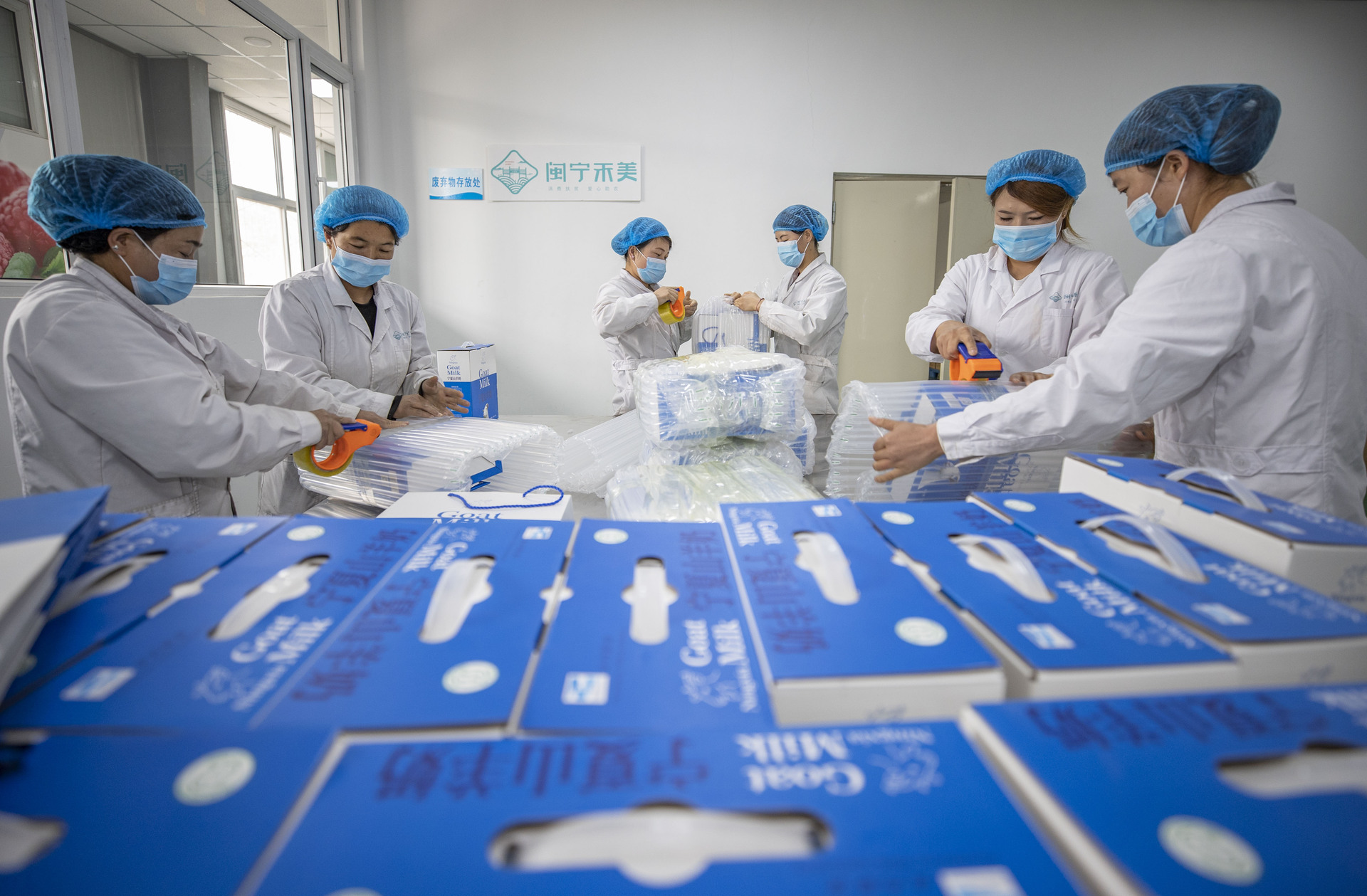 在宁夏银川市永宁县闽宁镇禾美电商车间,工作人员在打包产品。图/杨植森