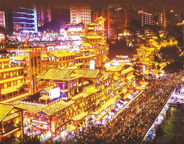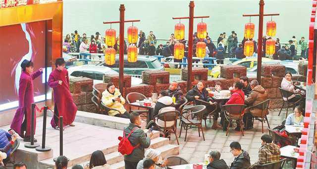▲游客在洪崖洞景区边品美味边赏节目。特约摄影 钟志兵/视觉重庆
