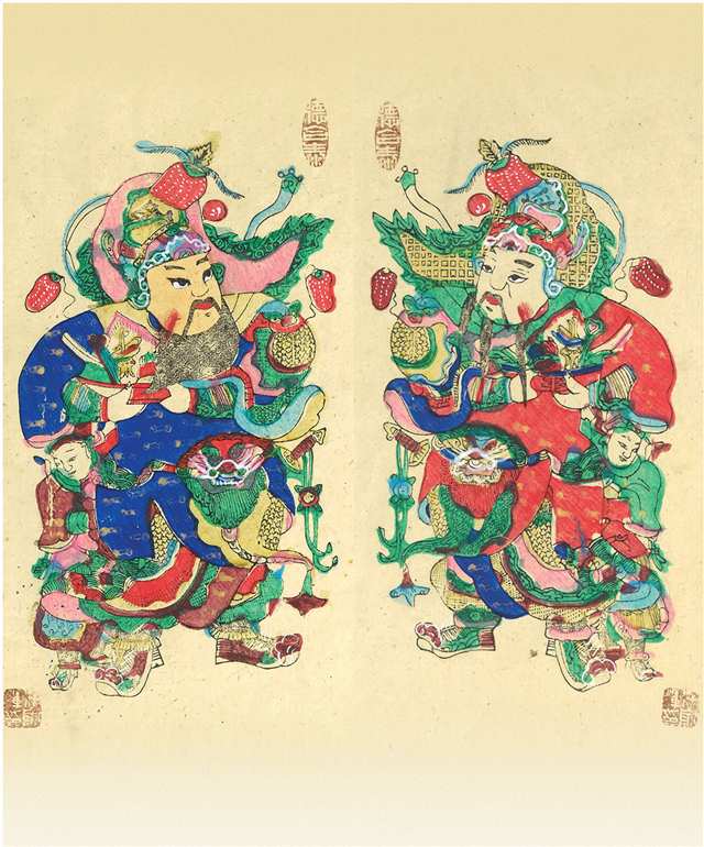 梁平年画起源于清初,人物造型古雅雍容,神态生动。尤其是门神画人物,夸大头部突出五官,并且缩短下肢,“英雄无项,美女无肩,文人如钉,武夫如弓”。民间匠师在处理鼻子时,多用一特制的上小下大有如木杵的鼻子轮廓线板,印墨线于面部中央,然后以此为准,逐一画出五官来,之后,在两颊下部抹上两道红色,这是梁平木版年画独具的艺术特色。有的门神画,在两侧下角通常任意增加1~5个小孩,整个画面显得稳重均衡。