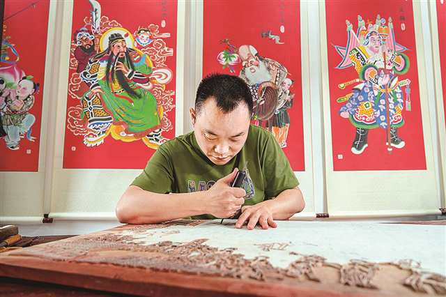 四川省绵竹市孝德镇绵竹年画村,绵竹年画国家级传承人陈兴才故居内,陈兴才的孙子、绵竹木版年画传承人陈刚在雕琢一幅充满烟火气息的年画木刻版。