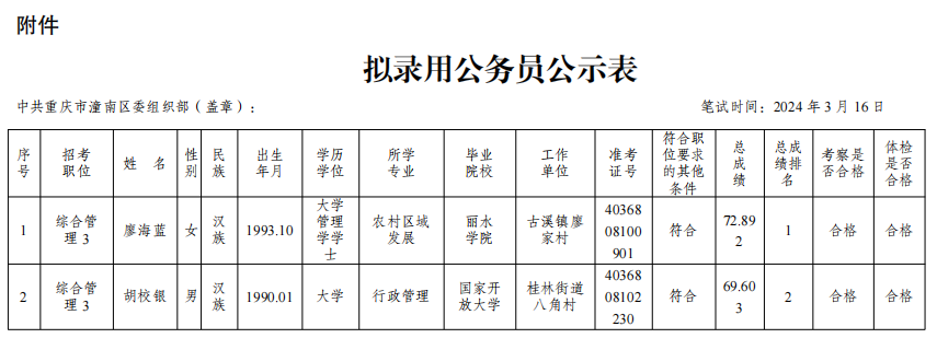 潼南区2024年从优秀村(社区)干部中考试录用公务员拟录用人员公示
