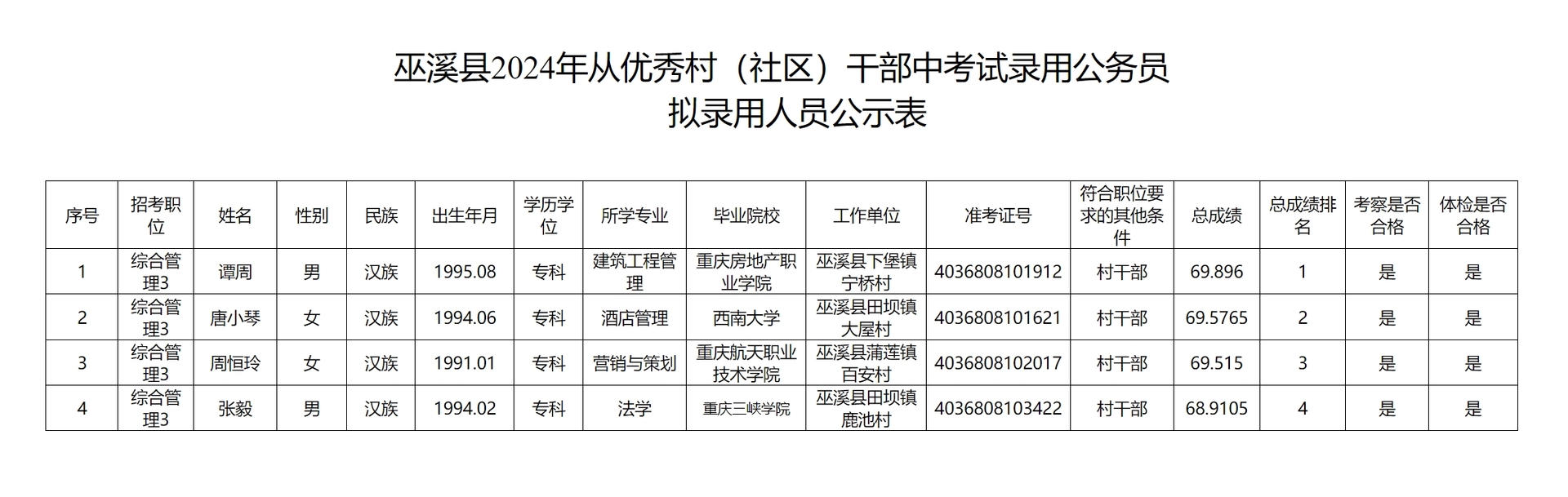 附:巫溪县2024年从优秀社区干部中考试录用公务员拟录用人员公示表
