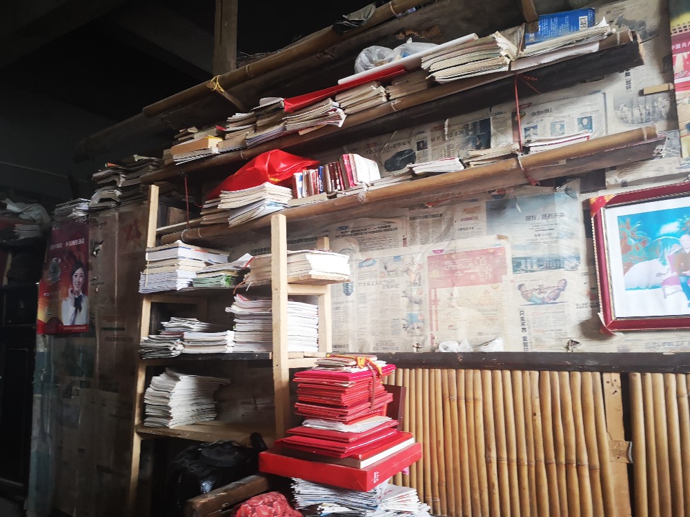 ▲简陋的书架上摆放着报刊书籍和奖品。 通讯员 肖怡 摄