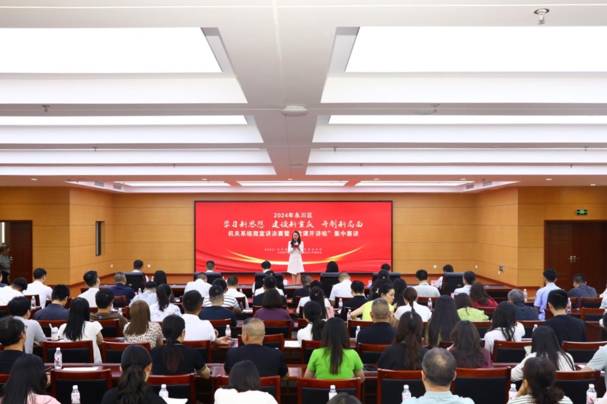 近日,重庆市永川区组织开展2024年机关系统“学习新思想 建设新重庆 开创新局面”微宣讲决赛暨“党课开讲啦”集中赛讲,10名宣讲员用生动的语言、鲜活的事例和饱满的热情,将党的创新理论转化为群众语言,给现场观众带来了一场思想洗礼。