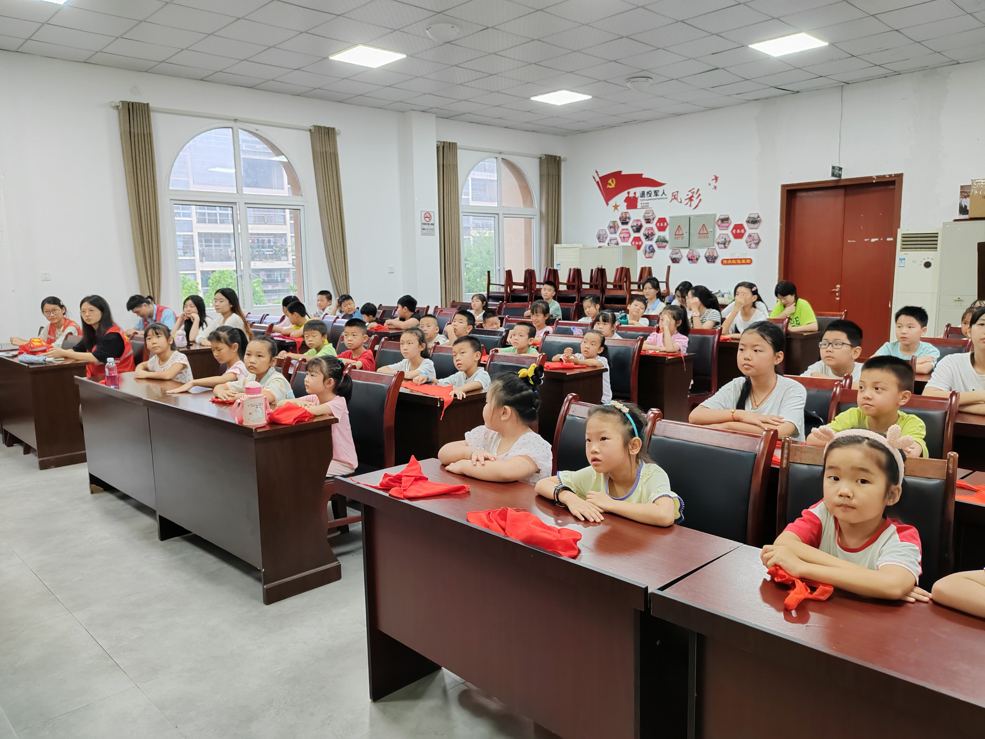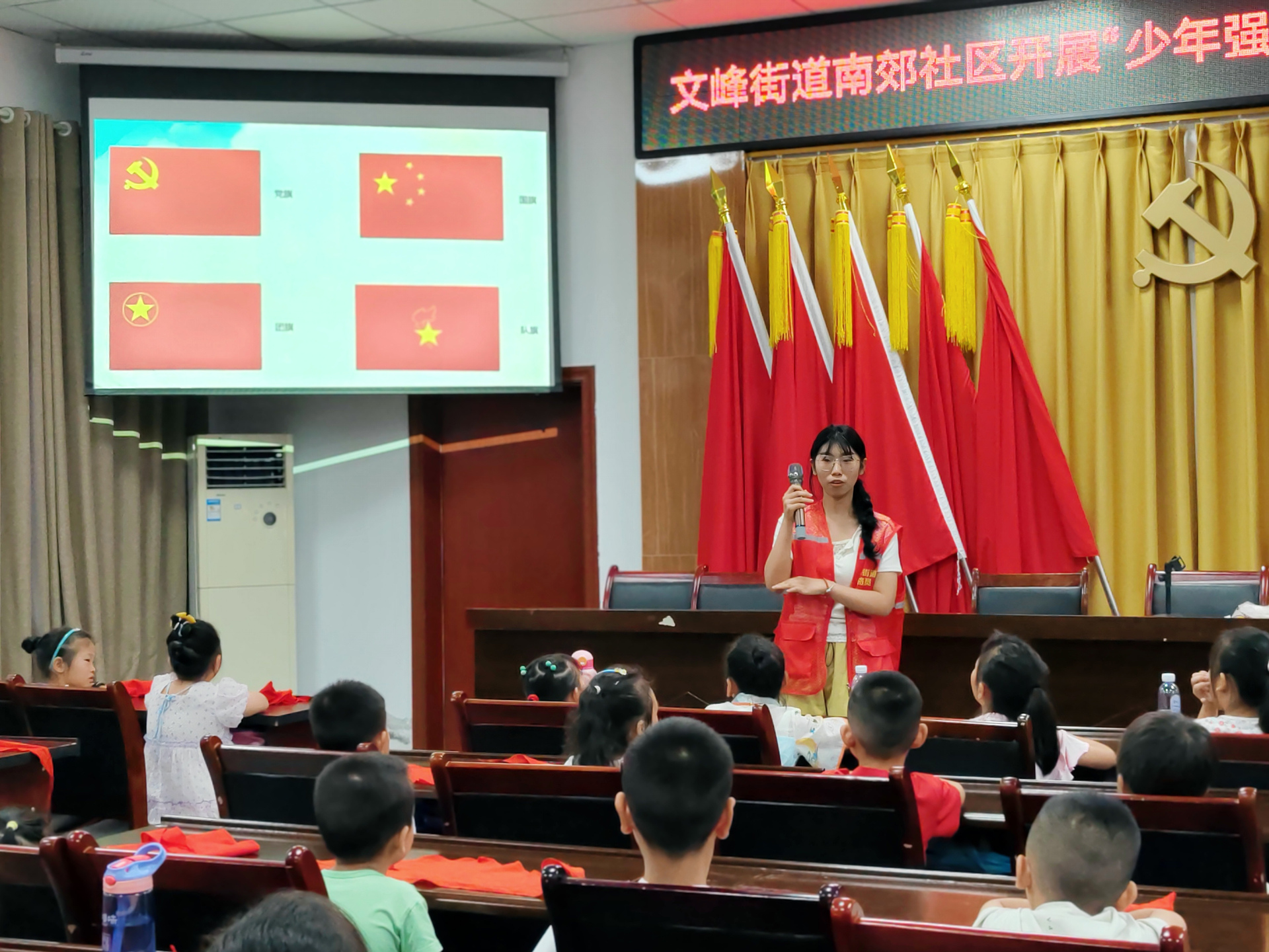 活动中,志愿者老师通过PPT、视频的方式分别向孩子们介绍党旗、党徽,团旗、团徽,队旗、队徽,让孩子知道作为少先队员是在中国共产党的领导下走向光明的未来,少先队正是建设社会主义和共产主义的预备队,同时教导他们珍惜来之不易的幸福生活,从小学党史,听党话,跟党走,努力学习,为祖国的建设和发展做贡献。志愿者现场手把手教授孩子们正确的红领巾系法,给他们讲授红领巾所象征的意义,告诫大家勿忘先辈的艰苦奋斗。