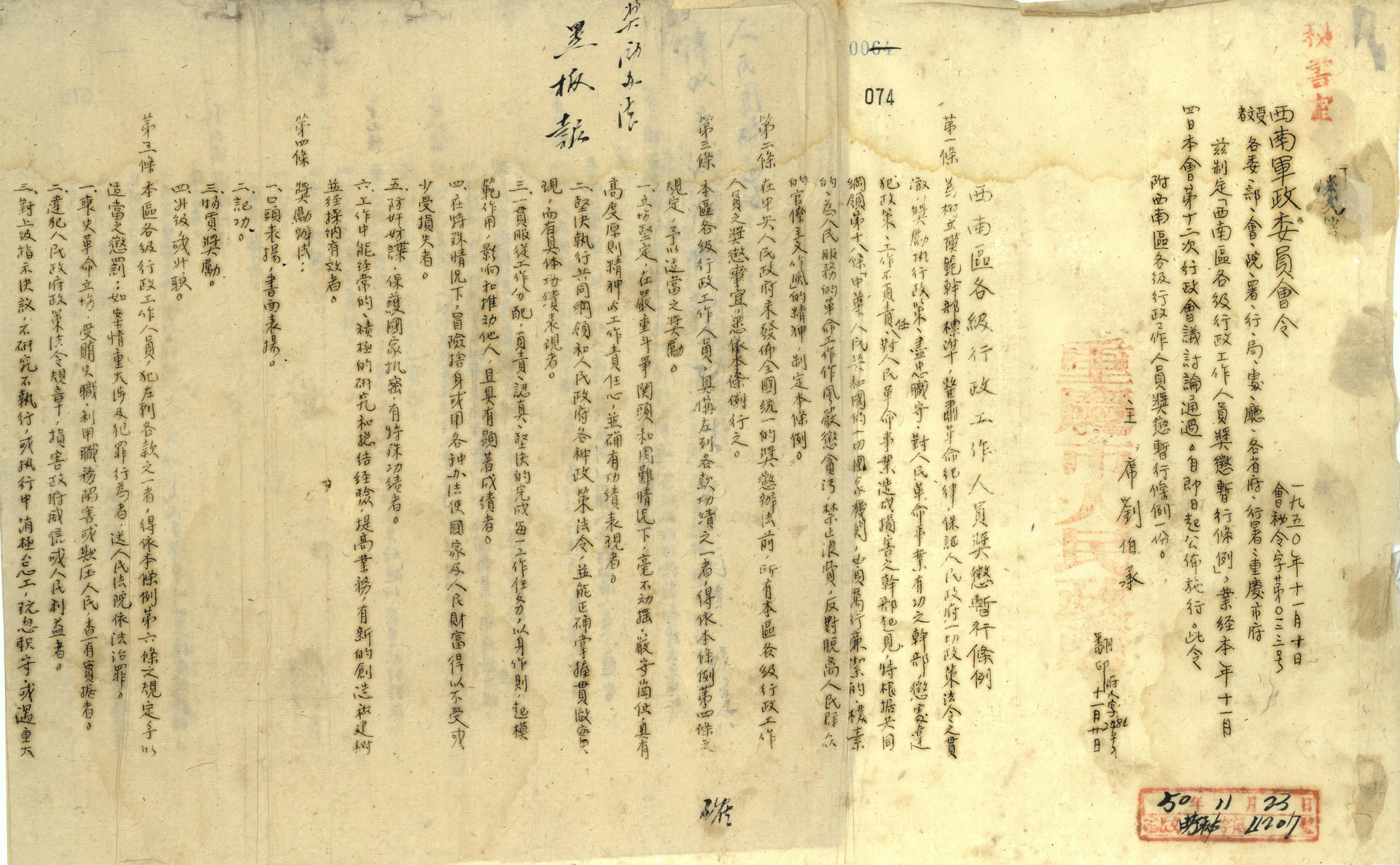 1950年,从中央到地方成立了党的纪律检查委员会和各级政府人民监察委员会,从组织监督上确保党员干部落实党的路线、方针、政策和法纪。为更好地监督和激励各级机关工作人员忠诚担当、忠于职守、严明纪律、服务人民,做到奖励、教育与惩戒相结合,结合西南区实际情况,1950年11月4日,西南军政委员会第十二次会议讨论通过《西南区各级行政工作人员奖惩暂行条例》,以此约束机关工作人员。11月10日,西南军政委员会主席刘伯承通令西南区各省、区、市及直属各部门执行,并于11月14日《新华日报》向全社会公布。