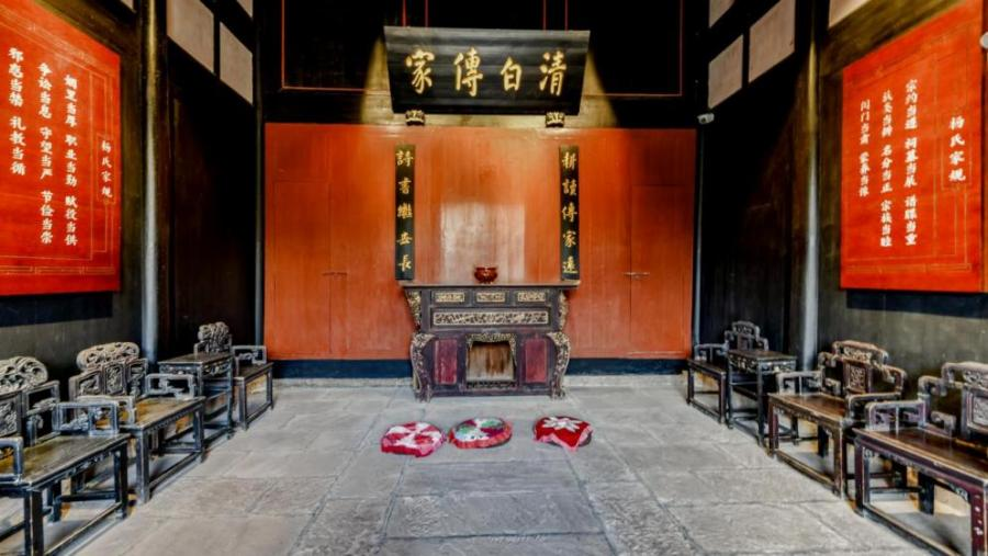 跨进大厅,通过大天井便是堂屋,悬挂有一匾额,上书:“清白传家”,两侧是另一副木联:“耕读传家远,诗书继世长。”堂屋两壁还挂有《杨氏家规十六条》。这里便是家主对其子孙进行家训家教的地方。后来,杨家诸多后辈走上革命道路,均以“清白传家”为准则,杨闇公便是其中的代表。