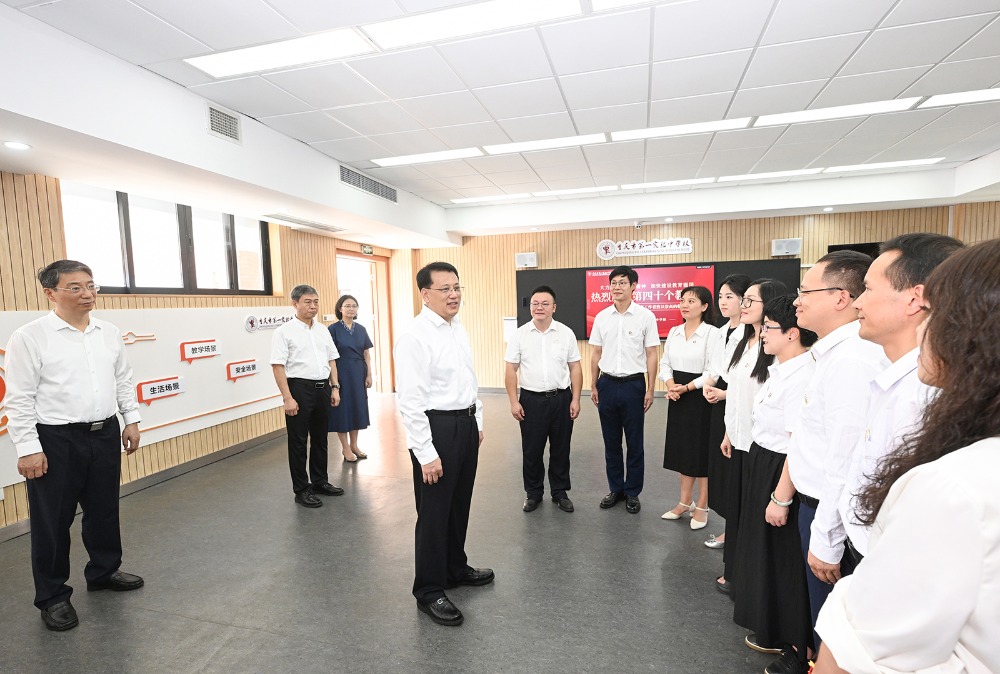 在重庆市第一实验中学,袁家军听取学校发展情况介绍,了解师资队伍、办学规模、育人体系,观看新智慧美育成果展、机器人训练展示等,同教师代表交谈。他指出,当前,全市上下正认真落实习近平总书记视察重庆重要讲话重要指示精神,全面推进现代化新重庆建设,为广大教师和教育工作者建功立业提供了广阔舞台。要创新教学方式方法,坚持不懈用习近平新时代中国特色社会主义思想铸魂育人,引导学生爱党爱国,厚植家国情怀,健全人格、提升本领,培养堪当民族复兴重任的时代新人。要加强高素质专业化教师队伍建设,激励广大教师为教育强市建设贡献力量,助力重庆打造西部地区教育“领头羊”。各级党委、政府要全面贯彻党的教育方针,加强教师待遇保障,维护教师职业尊严和合法权益,提高教师政治地位、社会地位、职业地位,大力弘扬尊师重教的社会风尚,让教师享有崇高社会声望、成为最受社会尊重的职业之一。