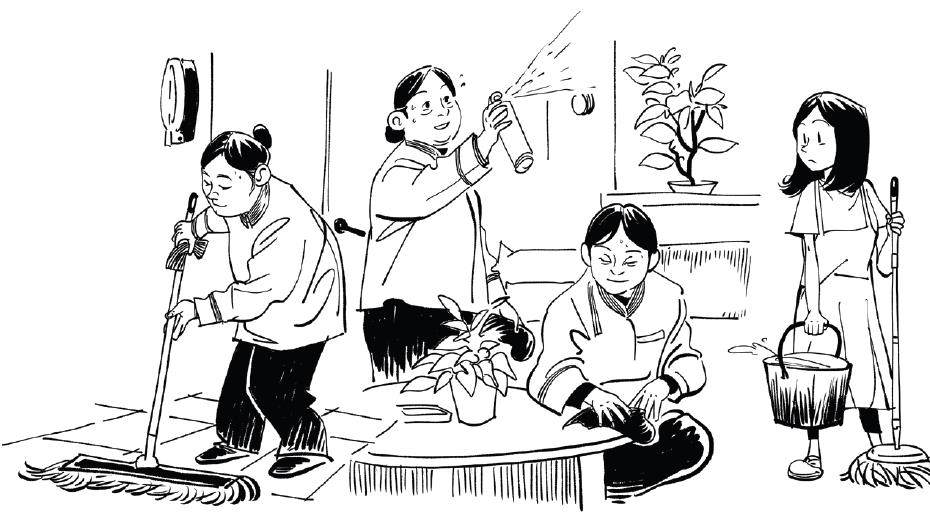 我坐在卫生间里,一边听着门口动静,一边和好友诉苦。门外的母亲突然大声叫我把水拎出来,我瞬间意识到有人来了,赶紧搬着水桶走出去,用余光一看,果然是工头站在门口,我搬着水桶走到刚刚干到一半的地方,拿起海绵擦继续擦起来。动作麻木地熬到12点,母亲示意我躺在她刚进来就扫干净又拖了几遍的地板上。