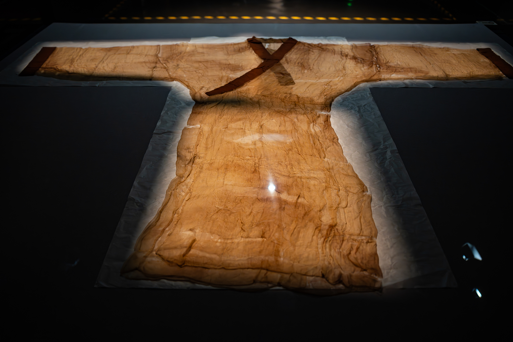 出土于湖南长沙马王堆一号汉墓辛追夫人墓葬的西汉早期织绣长袍,距今2200多年。是世界上最轻的素纱襌衣和最早的印花织物。