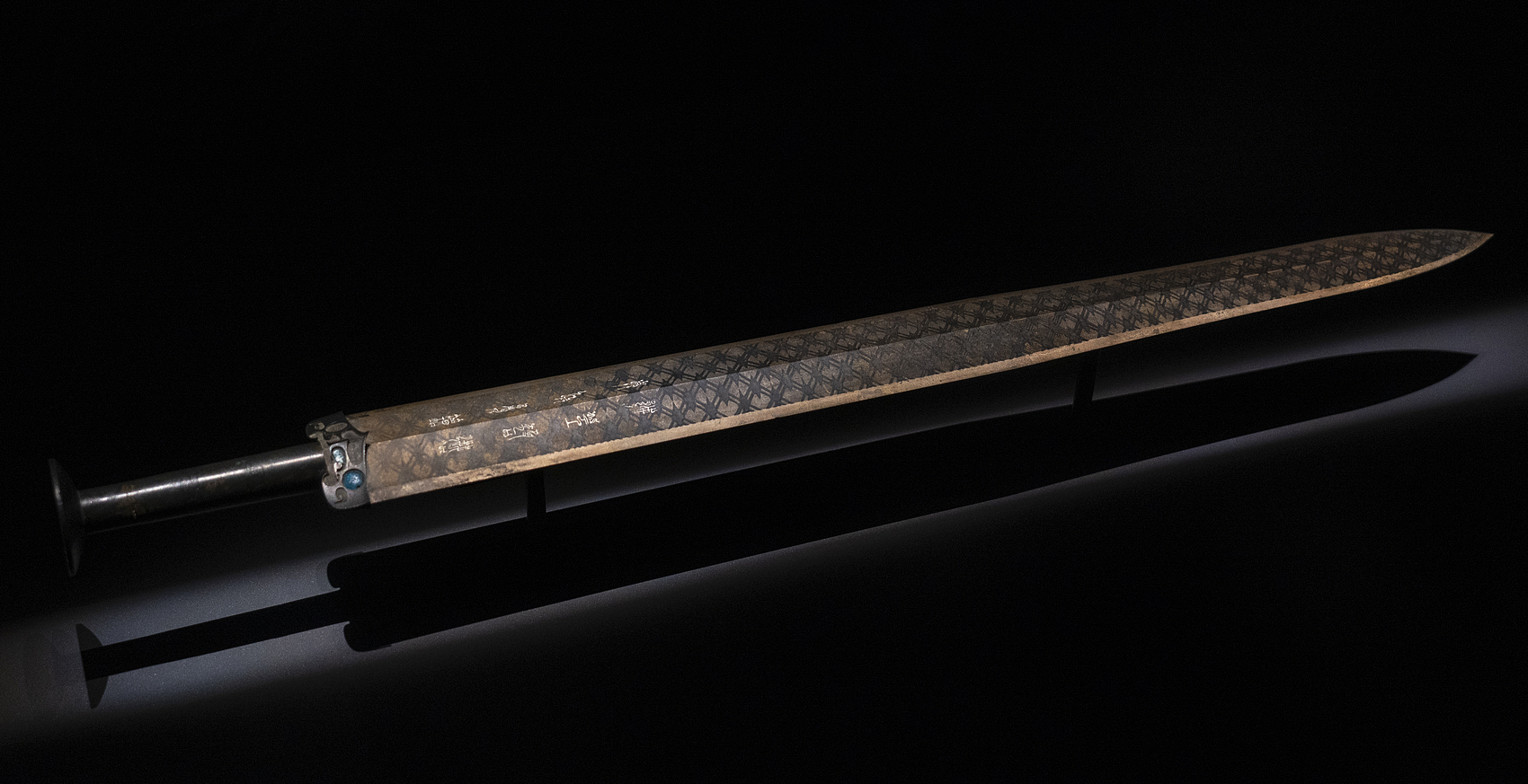 宽格上铸阳文鸟篆书“越王鸠践,自作用剑”。茎上两道凸箍,圆首饰同心圆纹,铸工精湛,被称为“天下第一剑”。
