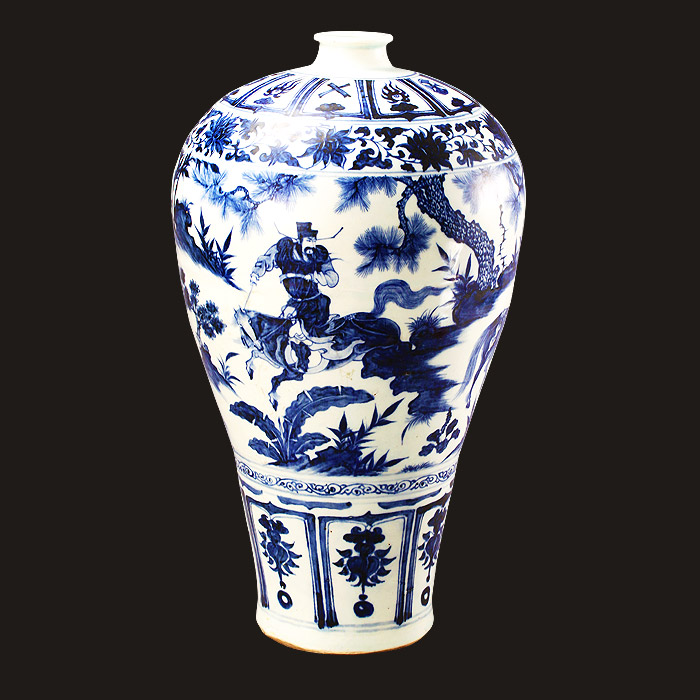1950年出土于江苏省南京市江宁区将军山沐英墓,是元末明初青花瓷中的罕见珍品,为国宝级文物,中国瓷器三绝之一。梅瓶由景德镇窑烧制,腹部绘制“萧何月下追韩信”历史故事。