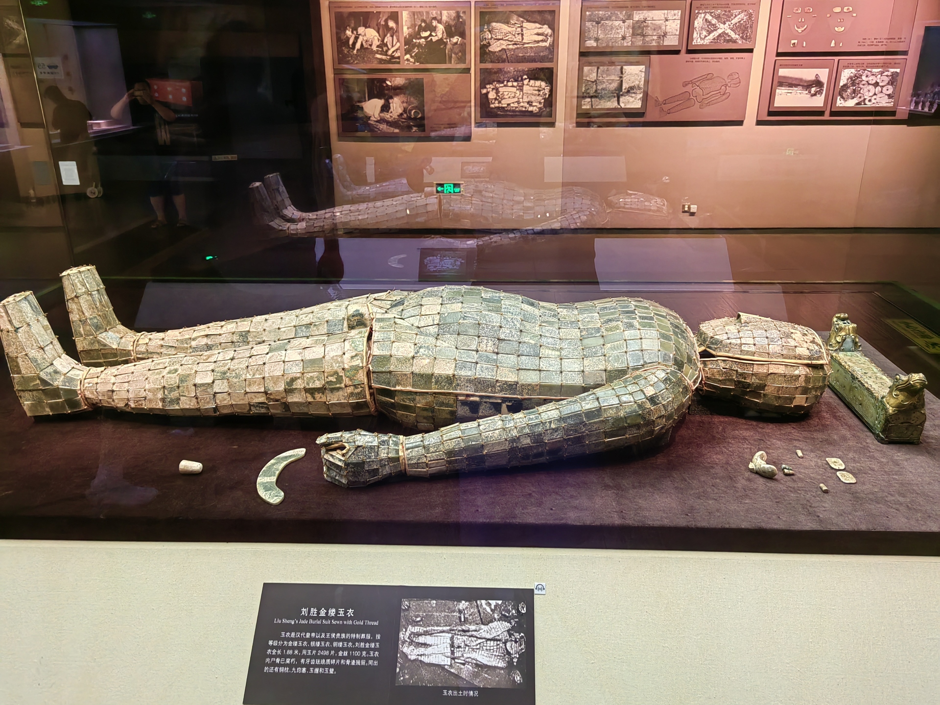 玉衣共用玉片2498片,金丝重1100克,其制作所消耗的人力和物力十分惊人。是我国考古发掘中发现最早、保存最完整的金缕玉衣。