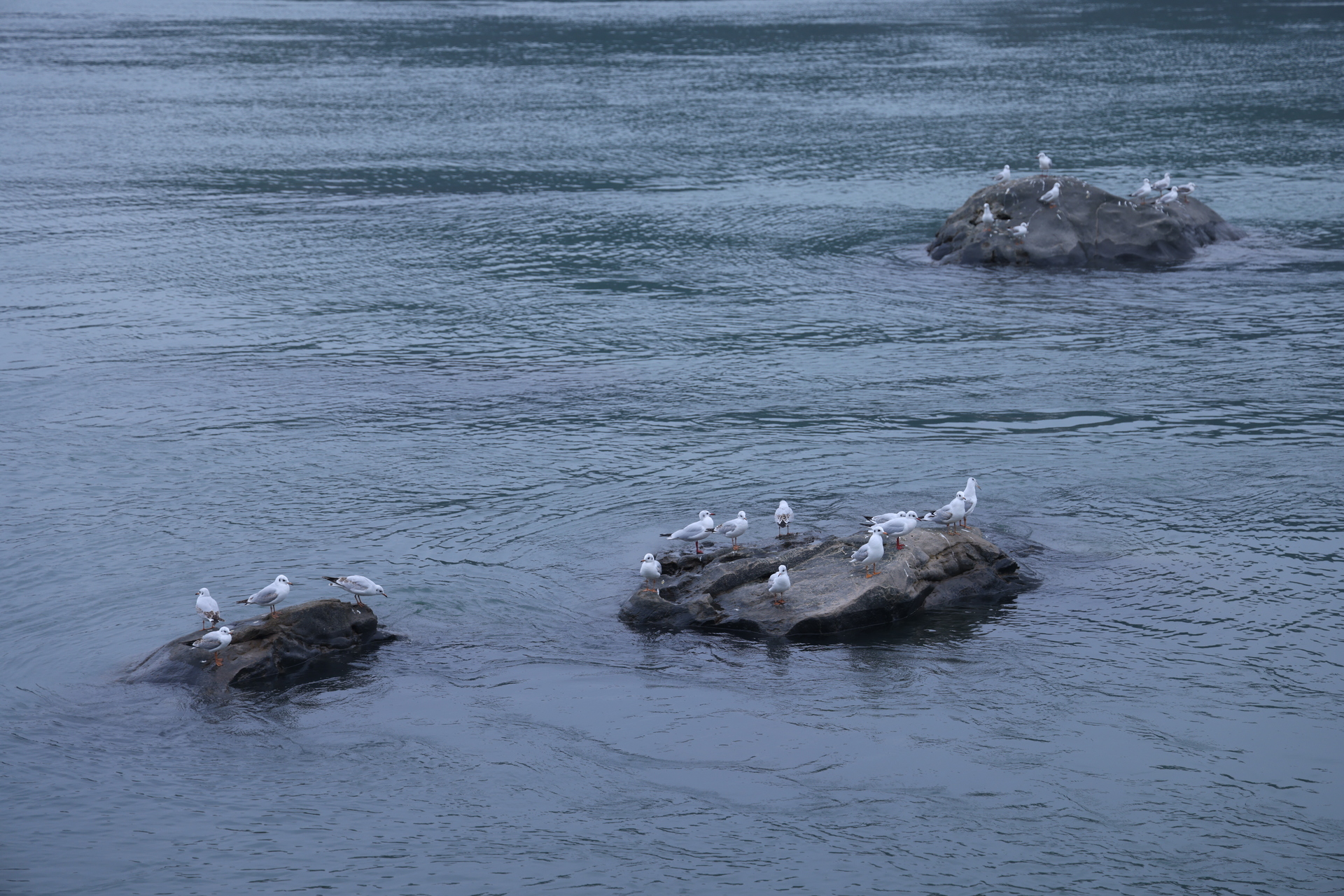 只听得“哗哗啦啦”一阵声响,一群红嘴鸥扑腾着翅膀,掠过长江水面,聚集到江岸的礁石上。