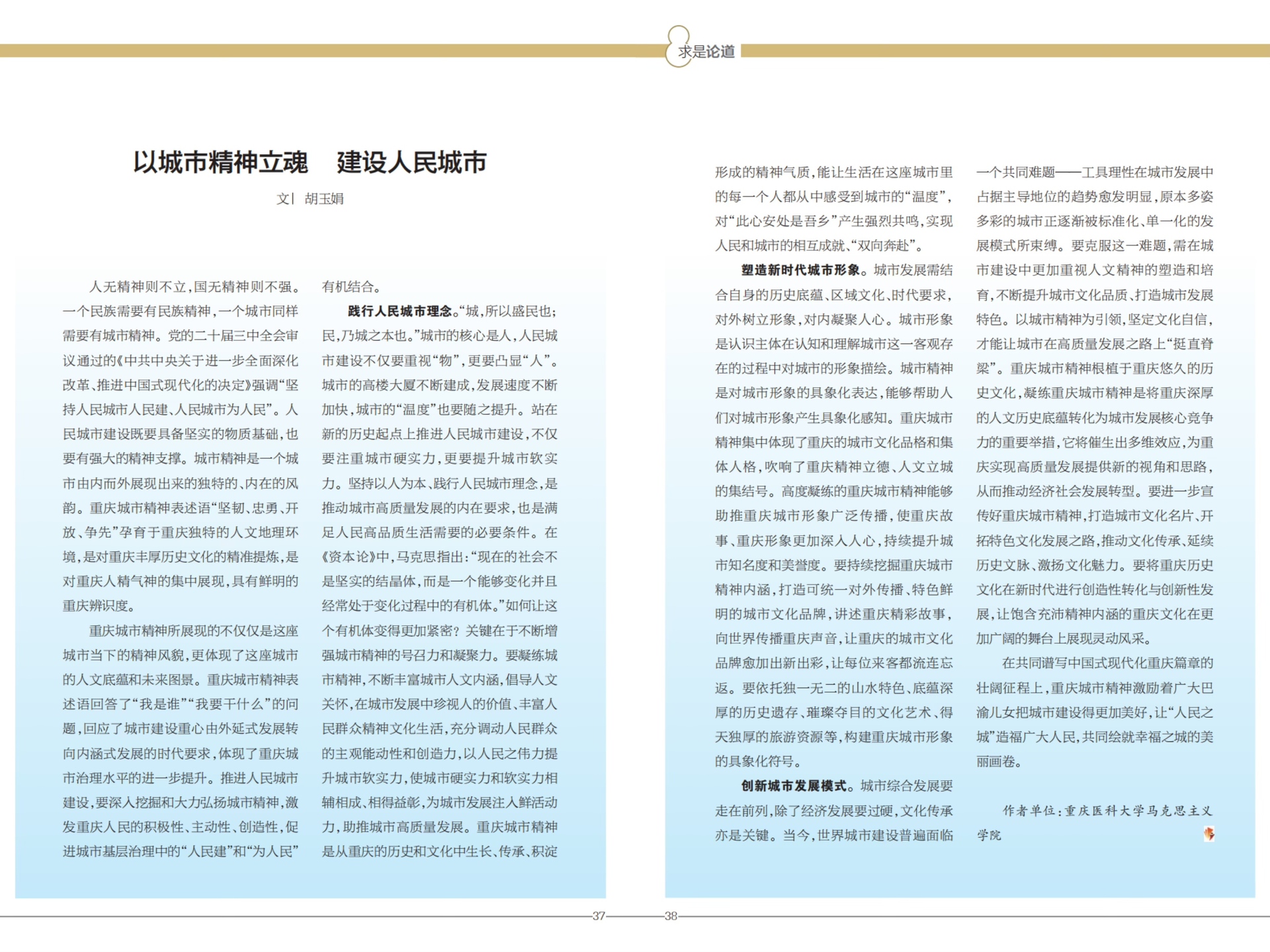 中共重庆市委机关刊物《当代党员》2025年第3期刊发重庆医科大学马克思主义学院胡玉娟的研究文章《以城市精神立魂 建设人民城市》,文章从三方面着手,阐述了以城市精神为引、建设人民城市,书写中国式现代化重庆篇章的重要性与实践路径。全文如下: