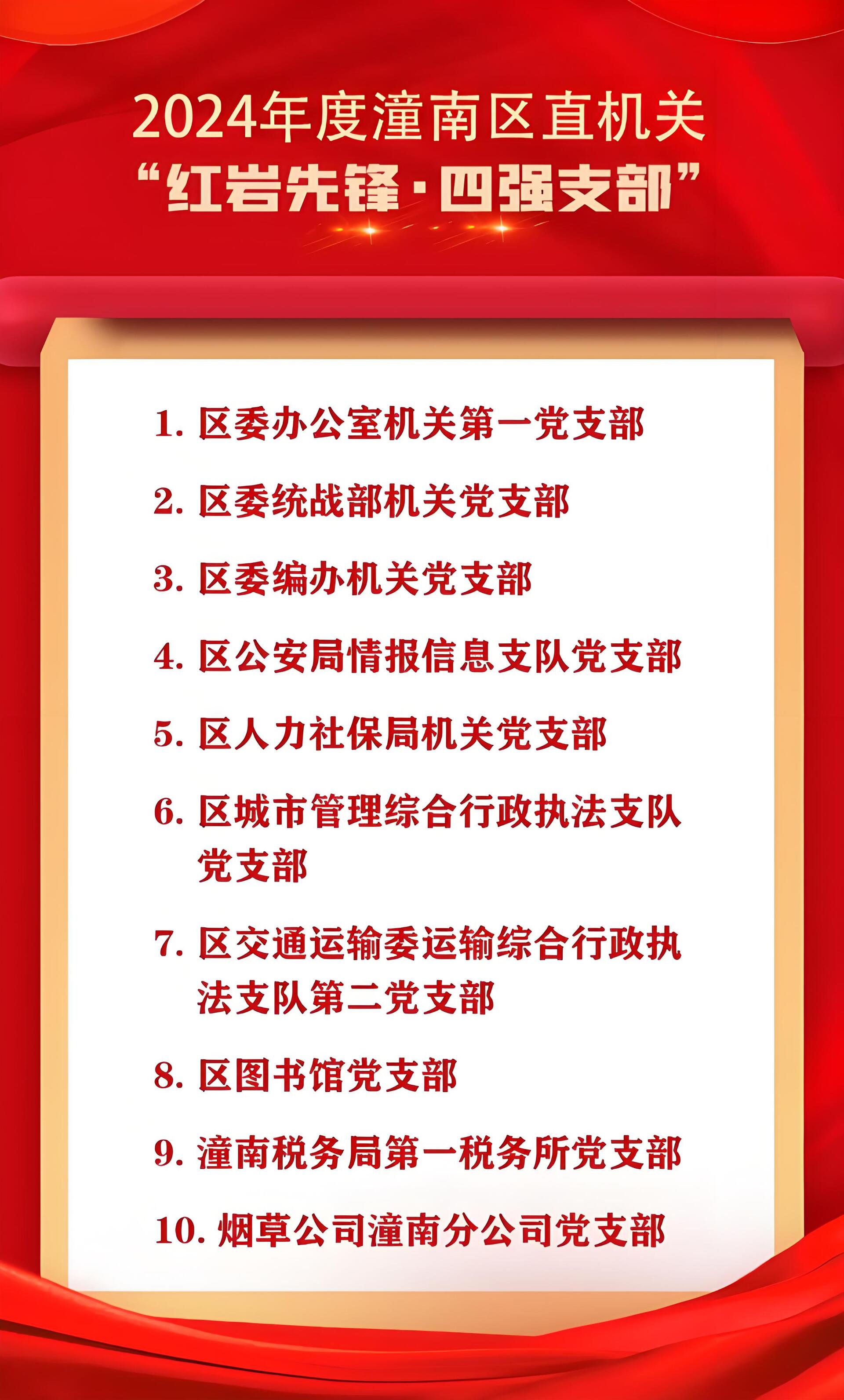 3月18日,重庆市潼南区委办公室机关第一党支部等10个支部被评选命名为2024年度潼南区直机关“红岩先锋·四强支部”。