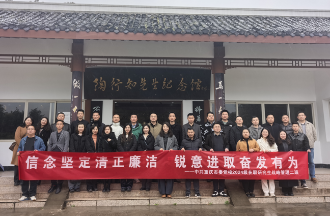 为深入学习贯彻中央八项规定精神,扎实开展学习教育,把党的纪律建设融入日常、抓在经常,引导学员把他律转化为自律,3月29日,中共重庆市委党校2024级在职研究生战略管理二班师生赴重庆市合川区陶行知先生纪念馆,开展以“信念坚定清正廉洁,锐意进取奋发有为”为主题的现场教学活动,引导同学们在理论学习的同时,深入了解历史人物的崇高精神追求和坚定理想信念,助力党校大力营造学习之风、朴素之风、清朗之风。