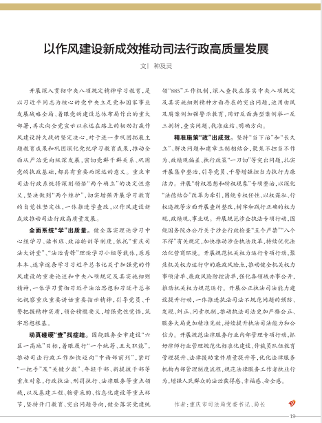 开展深入贯彻中央八项规定精神学习教育,是以习近平同志为核心的党中央立足党和国家事业发展战略全局、着眼党的建设总体布局作出的重大部署,再次向全党宣示以永远在路上的韧劲打赢作风建设持久战的坚定决心,对于进一步巩固拓展主题教育成果和巩固深化党纪学习教育成果,推动全面从严治党向纵深发展,密切党群干群关系、巩固党的执政基础,都具有重要而深远的意义。重庆市司法行政系统将深刻领悟“两个确立”的决定性意义,坚决做到“两个维护”,切实增强开展学习教育的自觉性坚定性,一体推进学查改,以作风建设新成效推动司法行政高质量发展。