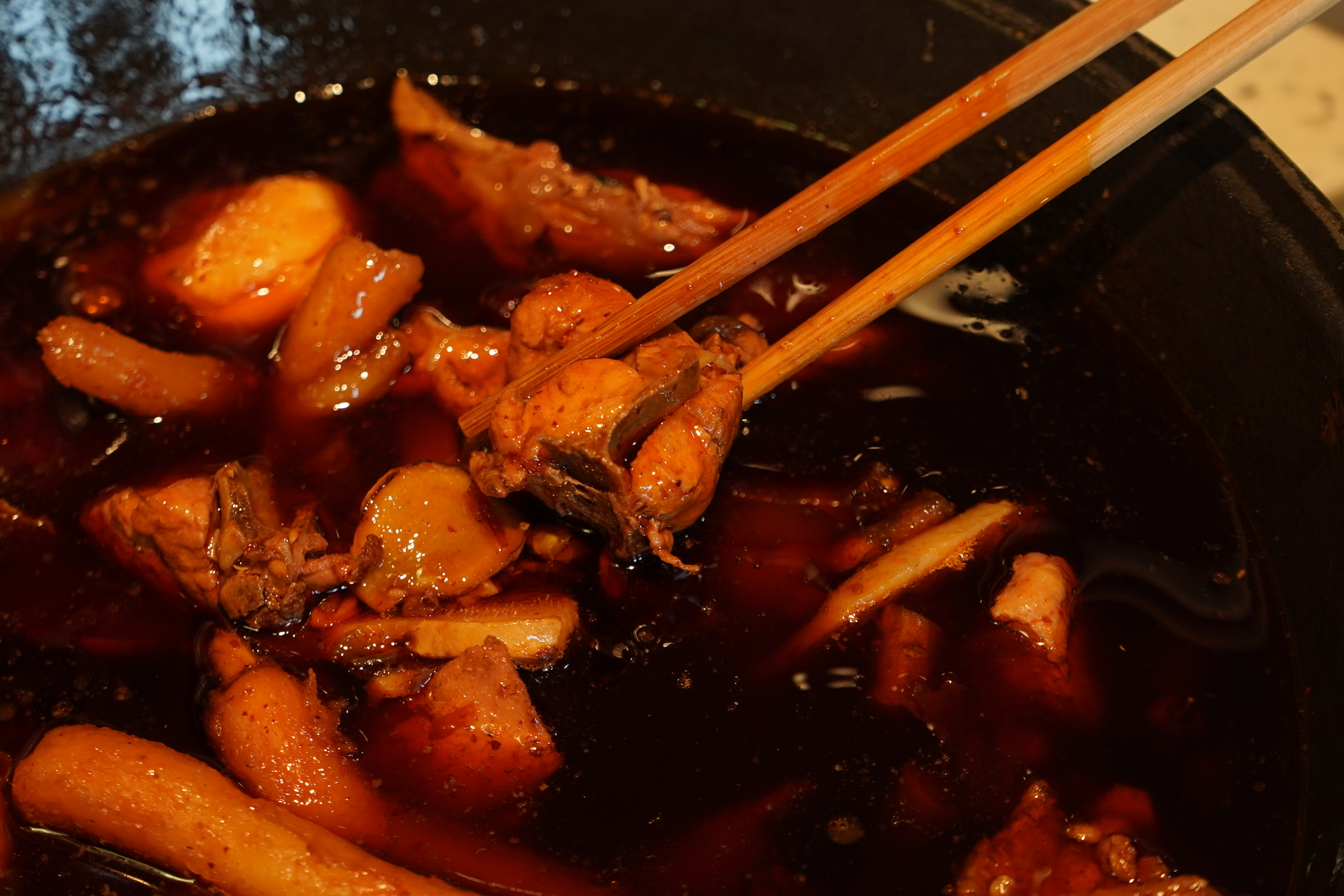 在重庆市渝中区,轨道交通李子坝站如今已是闻名遐迩的游玩“打卡点”。要是问起李子坝附近的美食,很多人会提起“李子坝梁山鸡”。这里的“梁山”是指重庆中心城区的“西大门”——中梁山。20世纪80年代,在中梁山上的一家工厂里,一位姓李的师傅善于烹饪鸡肉,其技艺深受工厂工人和周边群众青睐。工厂遭遇困难倒闭后,下岗的李师傅依靠烹饪鸡肉的技艺为生,他的店铺也被食客称为“梁山鸡”。后来他将店铺搬到李子坝附近经营,就有了“李子坝梁山鸡”之名。梁山鸡的做法,是在麻辣红汤中烹煮鸡肉,并添加沙参、枸杞、当归等中药材,增添药膳特有的香气。2023年,李子坝梁山鸡制作技艺入选渝中区第八批区级非物质文化遗产代表性项目名录。