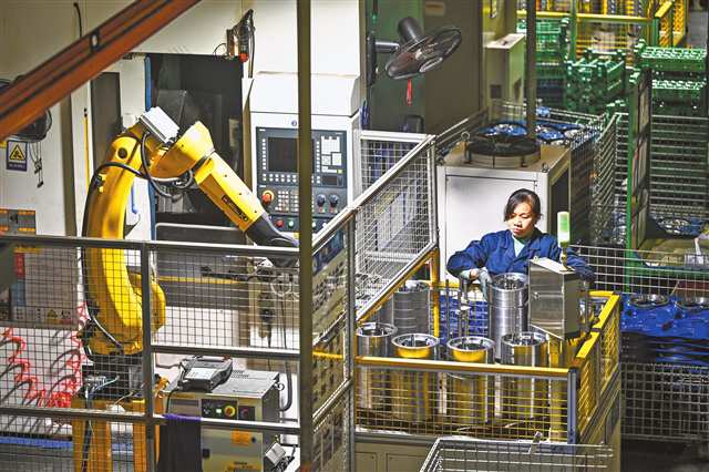位于重庆市大渡口区的重庆秋田齿轮有限责任公司生产车间,工人与机械臂协同生产新能源汽车齿轮。记者 谢智强 摄/视觉重庆