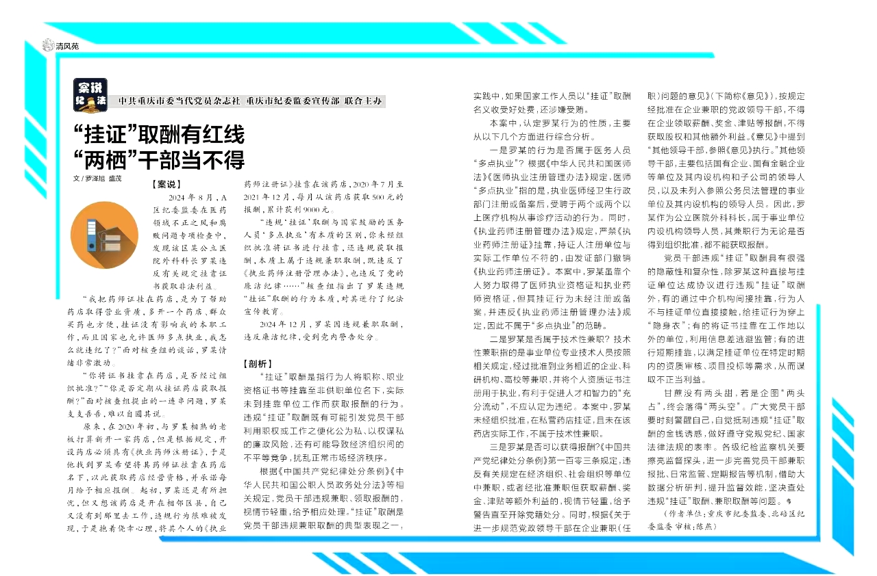 “违规‘挂证’取酬与国家鼓励的医务人员‘多点执业’有本质的区别,你未经组织批准将证书进行挂靠,还违规获取报酬,本质上属于违规兼职取酬,既违反了《执业药师注册管理办法》,也违反了党的廉洁纪律……”核查组指出了罗某违规“挂证”取酬的行为本质,对其进行了纪法宣传教育。
