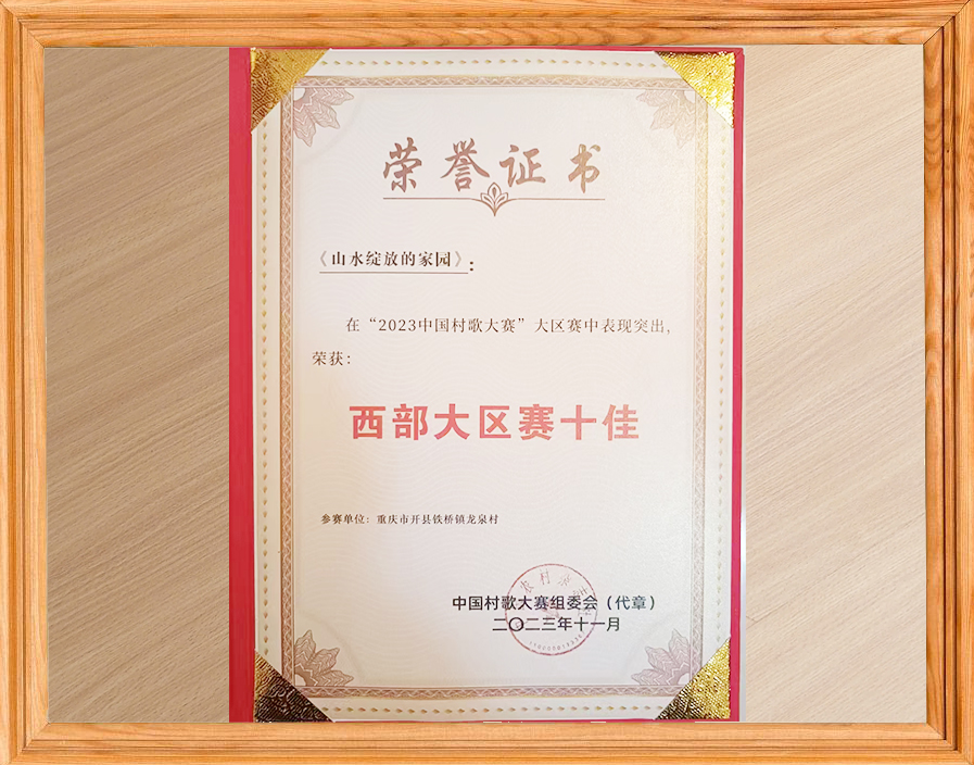 【物件讲述:这一本红彤彤的荣誉证书,是重庆幼儿师范高等专科学校副教授、开州区铁桥镇龙泉村驻村第一书记宋瑞组织村民共同创作的村歌《山水绽放的家园》,在参加“2023年中国村歌大赛”大区赛获得“西部大区赛十佳”的荣誉证书。】