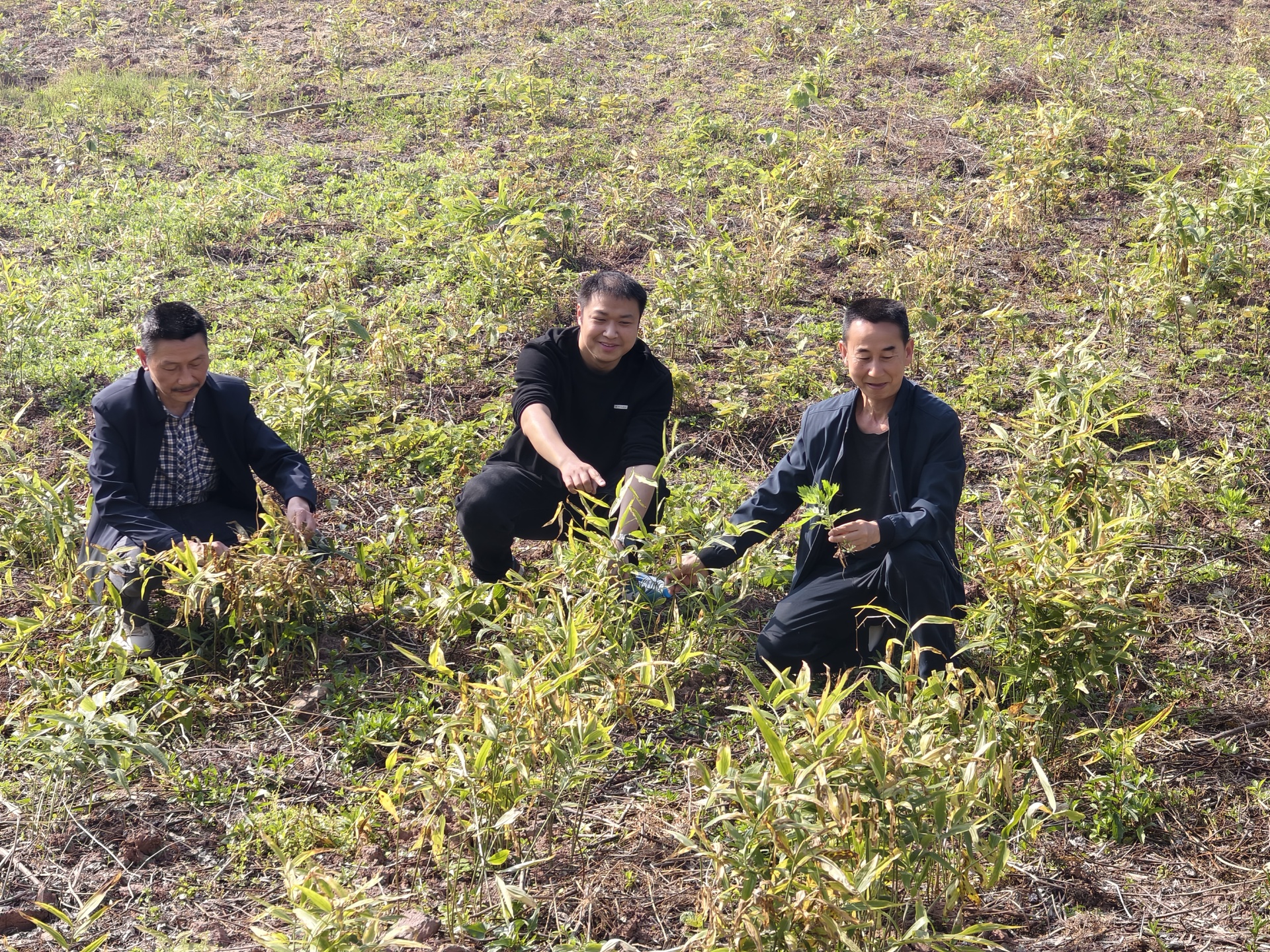 宋瑞(中)与村支“两委”一起,查看中药材黄精生长情况。图/熊瑛