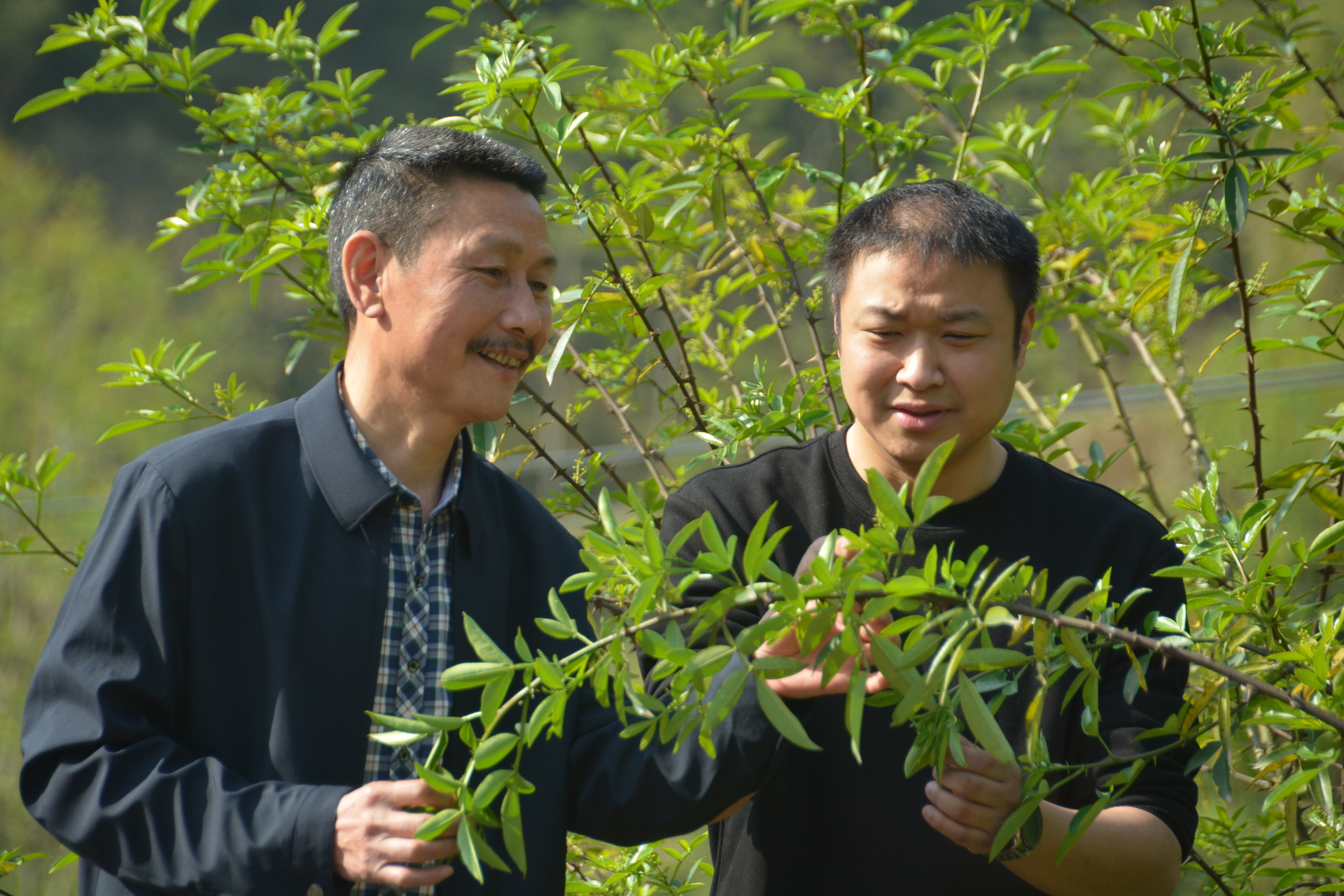 宋瑞(右)与村支部书记唐仕林查看花椒生长情况。图/熊瑛