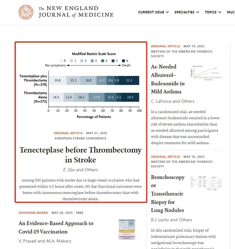5月21日,记者从陆军军医大学新桥医院获悉,该院神经内科杨清武教授和资文杰教授团队研究成果《替奈普酶静脉溶栓联合取栓术对比单独取栓术治疗急性大血管闭塞性卒中的多中心随机对照试验(BRIDGE-TNK)》再次登顶国际顶尖医学期刊《新英格兰医学杂志》(NEJM)。