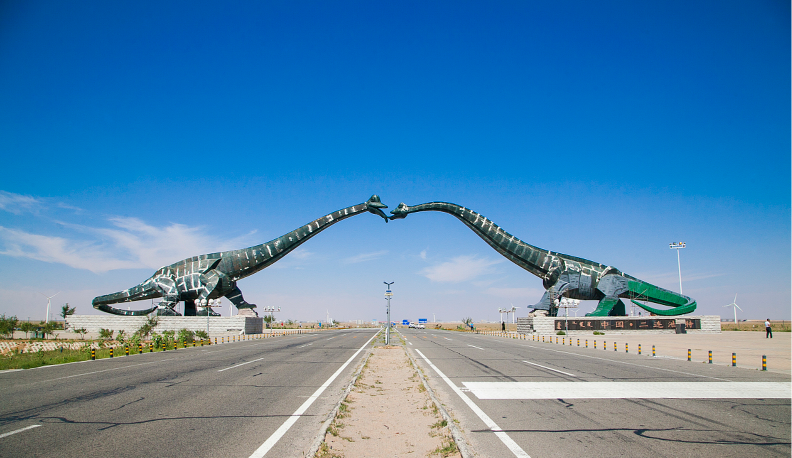 即将进入二连浩特市区,两头头部相交的长颈龙横亘在公路上方,如同拱门一般,欢迎着远道而来的客人,被称为“恐龙市门”。二连浩特是著名的恐龙之乡,在市区东北不远的地方,有一片盐池,是二连浩特最早有人居住的地方,盐池不远处,就是二连盆地白垩纪恐龙国家地质公园,空间维度近在咫尺,时间维度却远隔亿万年。