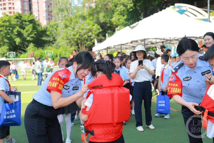 “夏季天气炎热,但是大家可千万不能下河游泳哟!”在水警的摊位前,“爱心妈妈”开展防溺水安全互动课堂。“爱心妈妈”告诉孩子们,除了不准私自下水游泳外,也不要到不熟悉的水域游泳,不准擅自与他人结伴游泳、不准到无安全设施、无救援人员的水域游泳等,并在现场教他们如何正确使用救生衣。