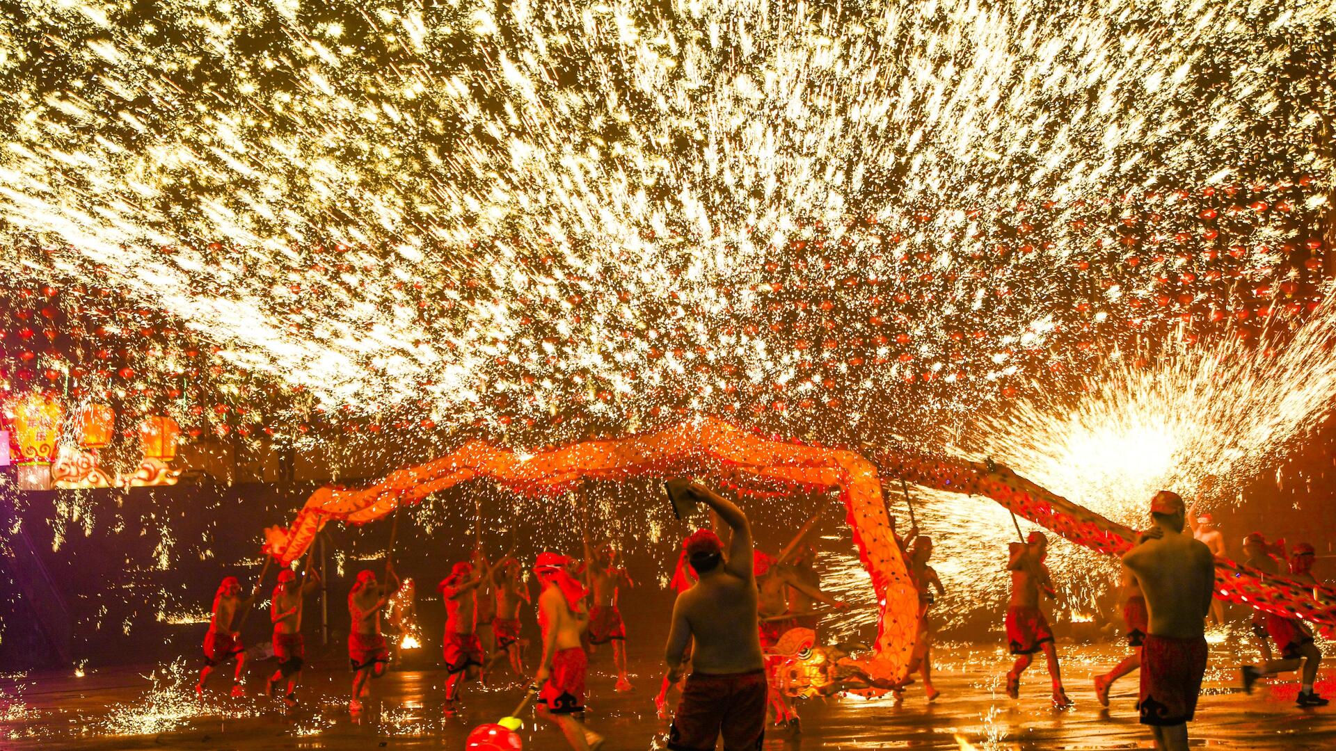 夜幕下,《追梦·铜梁龙》的表演即将迎来尾声。高亢激昂的音乐鸣奏不绝,一条火花四溅的金龙划破长空,龙舞演员赤膊上阵,挥舞着火龙盘旋飞腾。烧至1600摄氏度的火红铁水被高高泼洒到空中,刹那间,万千流星坠落,犹如一树树金花在夜空绽放。