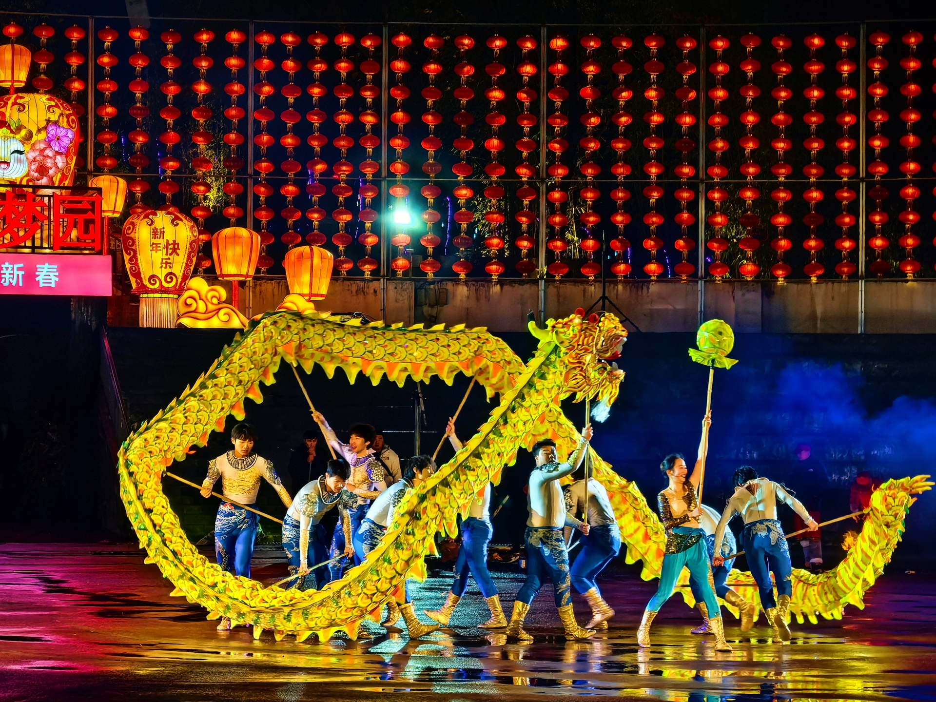 现场,趁着假期前来观看龙舞表演的人摩肩接踵,看台内坐满了人,连围栏边也站满了人……语笑喧阗、夔鼓声声,威亚灯笼悬作满天星斗,整片山水仿佛一部流动的史诗。