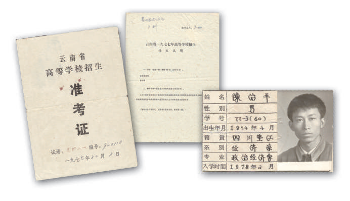 重庆市档案馆收藏了一组难得的高考档案,档案中有云南省高等学校招生准考证、云南省1977年高等学校招生语文试题、昆明电报局发给黎明农场一分厂厂部关于陈治平被四川大学录取的电报、云南省西双版纳傣族自治州勐海县公安局颁发的通行证、四川大学1977年度新生入学通知书、四川大学发给陈治平的学生证及学位证书等。