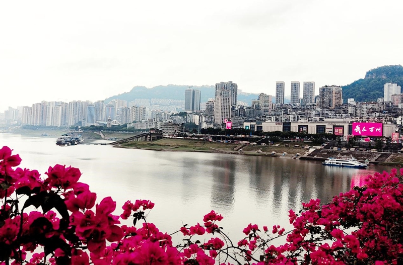其实,这里曾经是一片繁忙的江滩,那时水涨人退,水退人来。一到秋冬,人挤人船挨船,土产山货四面云集,饮食小摊,季节水果,草棚店铺,一直摆到南门口。现在还记得20世纪90年代初期,来万州工作时走过的那些街道和巷子,一马路、二马路和环城路,路路都被淹没在水下了。十七码头的梯子,杨家街口的身影,车水马龙的较场坝,人声鼎沸的沙河子,磐石上的座座煤山,岔街子的烟火气,永远留在了记忆里。当时没有想到的是,南门口会嬗变成今天的样子。目之所及的座座大桥像一道道彩虹横跨大江湖畔,尤其让眼前一亮的是独领时尚的万州红,有上百万株的三角梅,从这里链接到了江湖四岸,它们因为这场雨,迎来新一轮怒放,红透了一座城。三生有幸呀,我在万州!