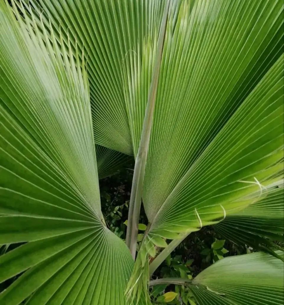 蒲扇源自蒲葵树,我们俗称“棕树”“棕叶子树”。屋前房后,家家户户都种着。做蒲扇工序简单,只需把叶子砍下来,留足够长的叶柄,晾晒20天左右,树叶逐渐从深绿色变成淡绿色,变成浅灰色,又变成了灰白色。充分干燥以后,剪成圆形或者心形,用开水烫一下或火烤一下,再用石板压平。蒲扇的雏形和功能基本上出来了,这时候拿来扇风,也是可以的。但是剪过的叶子,会留下比较硬的茎秆和比较锋利的叶片,需要包裹边缘,也作简单的美化。用白麻布或棉布裁成细条,也有的用蓝碎花布,或者用细竹编成的软条,材质更加接近,结实又耐用。在脚踩的缝纫机上围着边缘来回缝两圈,一把蒲扇就大功告成了。蒲扇的原材料到处都有,制作简单,又很便宜,几乎是家家户户都有的生活便利品。