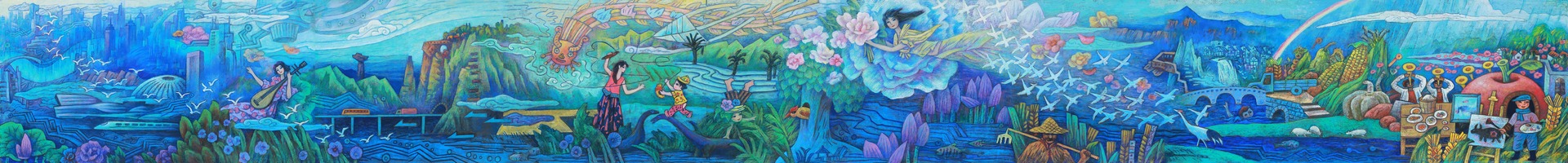 这幅浸透五色颜料的木刻长卷,恰似綦江发展的基因图谱——青黑河脉诉说着綦江的源远流长;红色映照着革命烽火;翠绿生长着改革春芽;金黄凝结着乡村振兴的丰饶;绛紫如矿脉深处的火焰,从东汉采煤窑址的炭痕中升腾,在当代页岩气井架的钢铁骨骼间流淌。整幅长卷里,银白色的动车组劈开晨雾呼啸而过,古老刻痕与现代轨迹在田野上空交汇成历史的经纬。