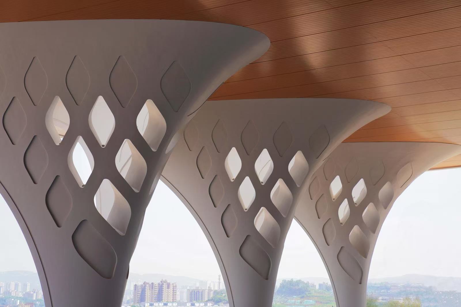 正是这样极致的追求与创新的工艺,使得树形柱的每一处拼接都如同自然界生长的树干般严丝合缝。在阳光的轻拂下,表面折射出流动的光影,与“山水巴渝”的设计理念完美融合,浑然一体。