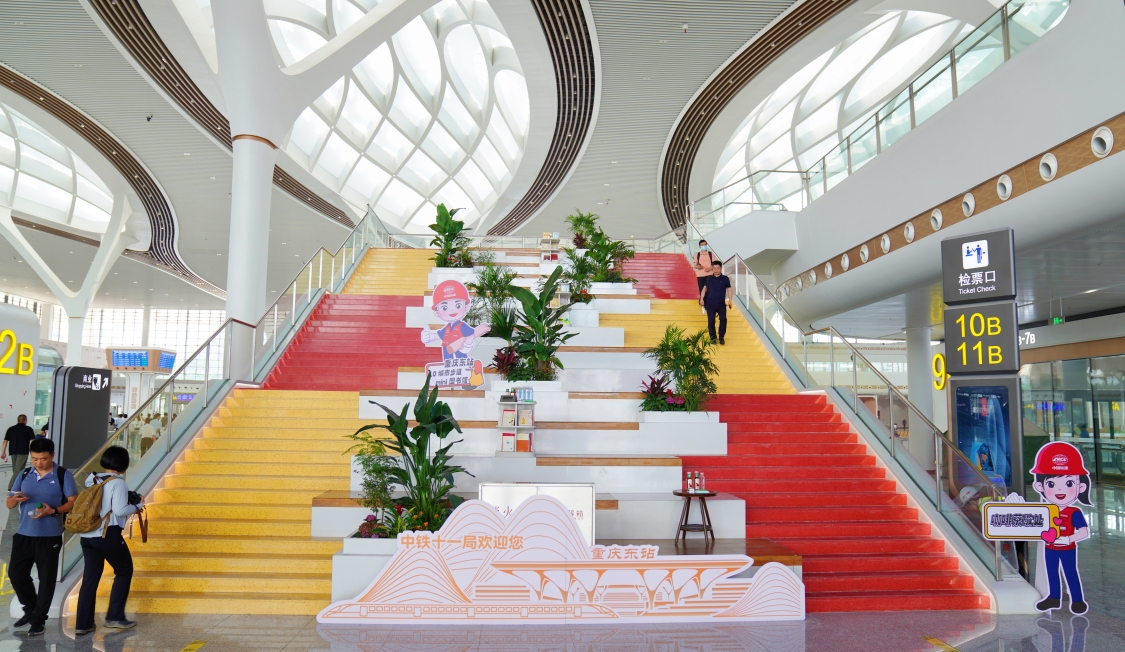 “我们参照重庆独特的立体空间特色,创新性地将传统楼梯空间升级为‘通行+休闲+阅读’多功能区,既节省了枢纽空间,又为旅客提供了‘慢下来’的选择。”中铁十一局重庆东站项目总工程师周海彬介绍。
