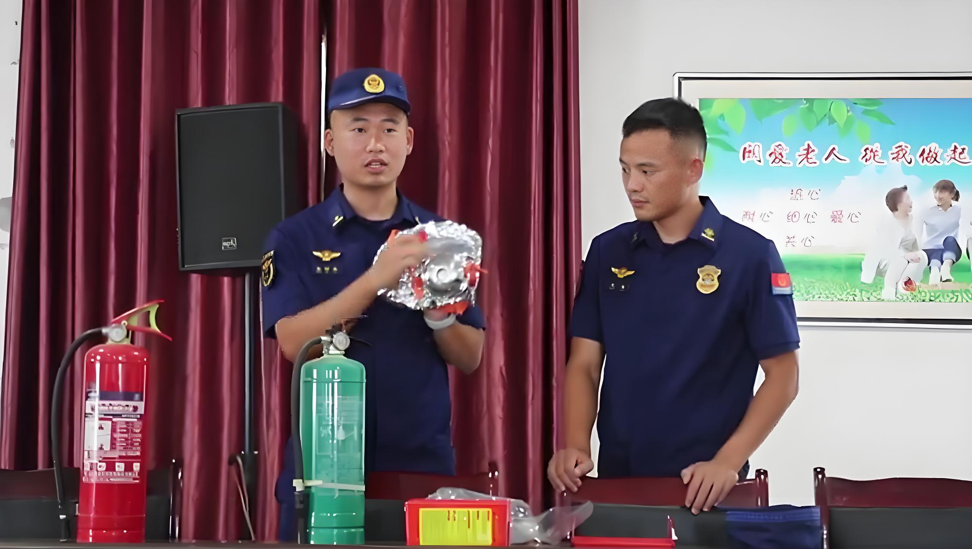 讲师团成员针对敬老院的实际情况,详细讲解了过滤式自救呼吸器和灭火器的使用方法,重点传授灭火器“提、拔、握、压”四步诀。
